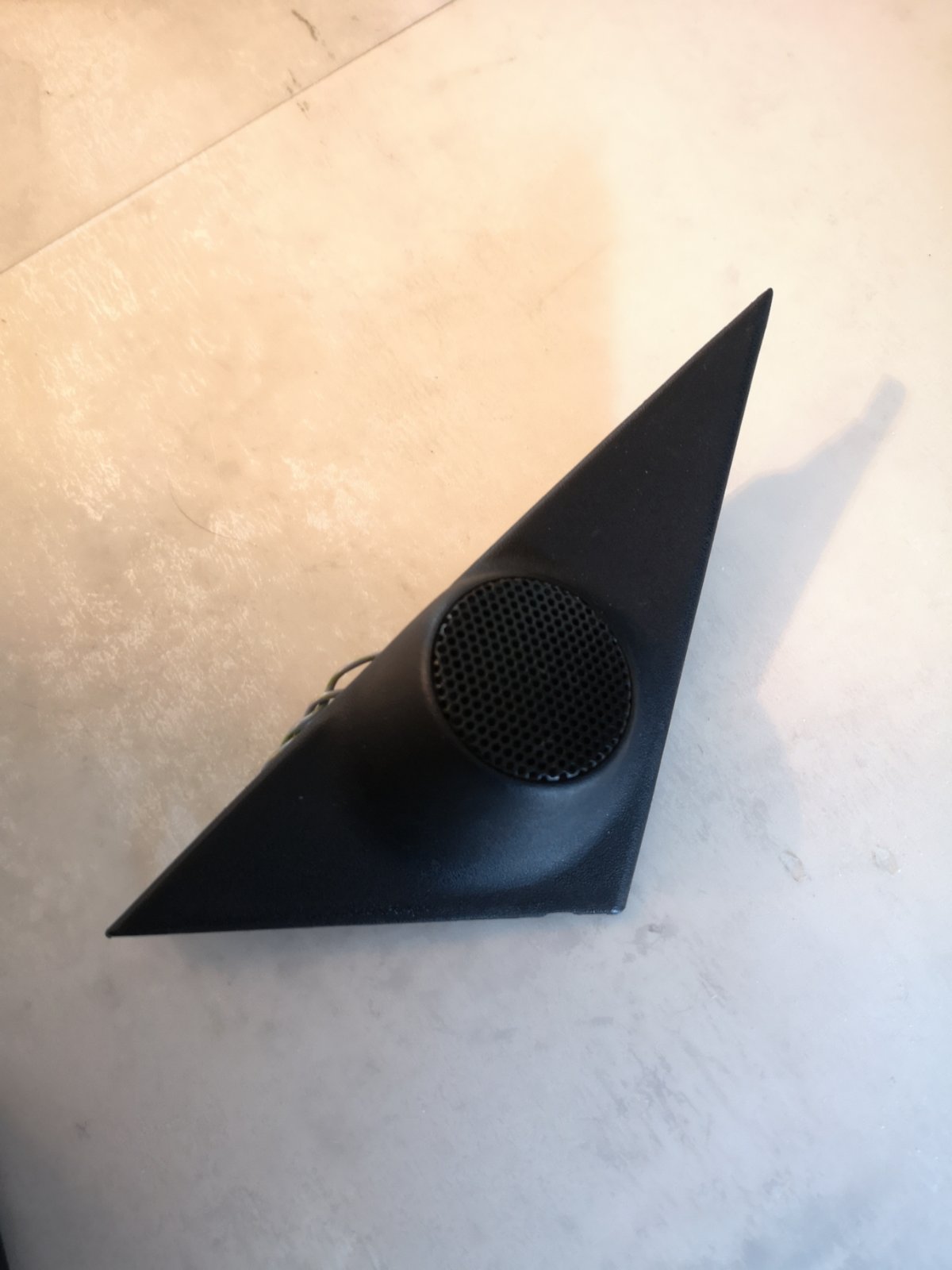 - Desni visokotonec. Delujoč in na zunaj lep (mrežica črna, nič spraskana plastika). Zadaj ima pritrdilni del štiftka polomljen, ampak štift je zraven, tako da se da zadevo enostavno popraviti. 50€