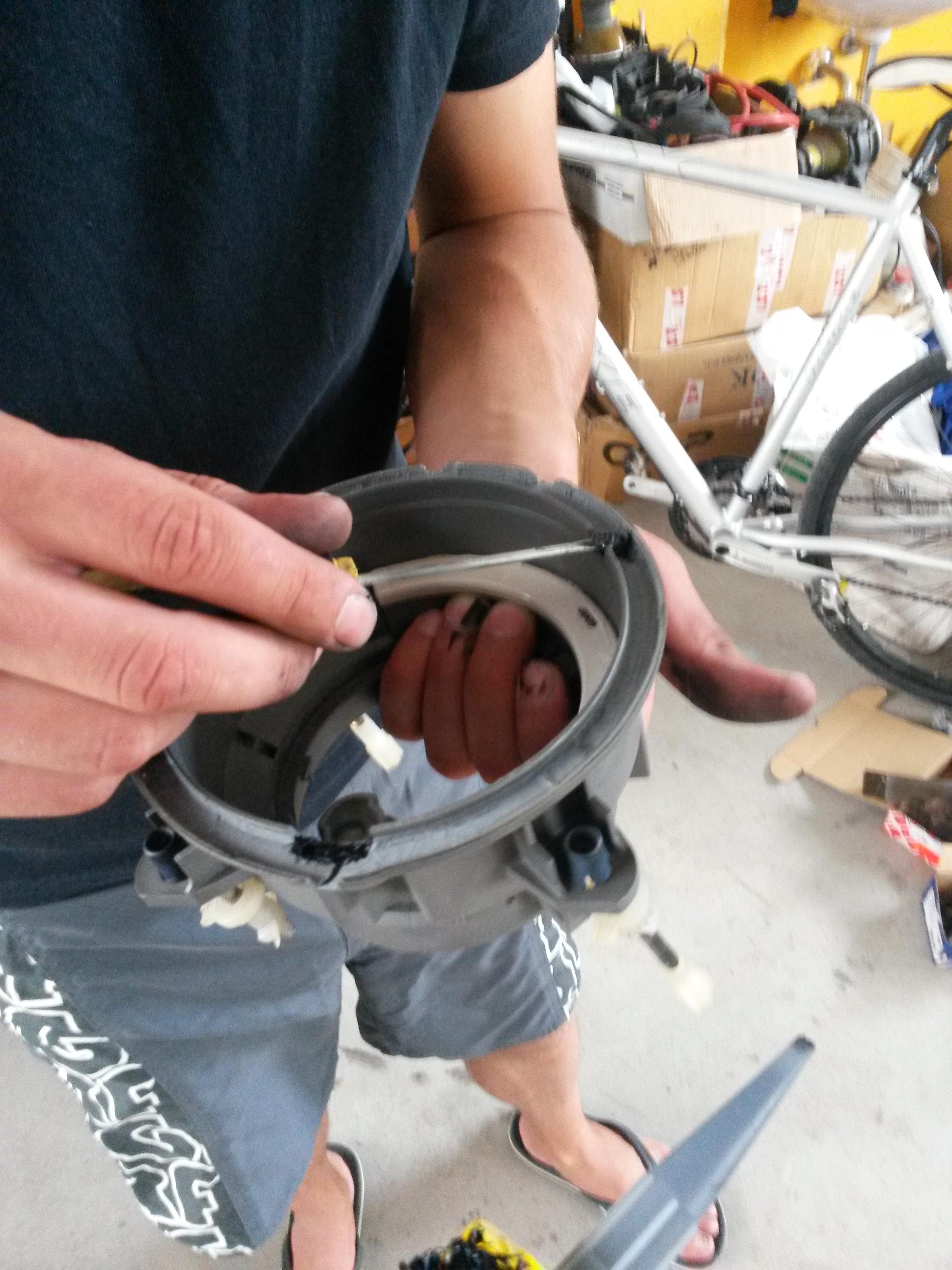Spodnji del ohišja skupaj z nosilcem leče odvijačimo in potegnemo ven. Najbolj se bomo osredotočili na zgornji del ohišja, kjer se nahaja plastika okrog leče, ki jo je potrebno potemniti.
