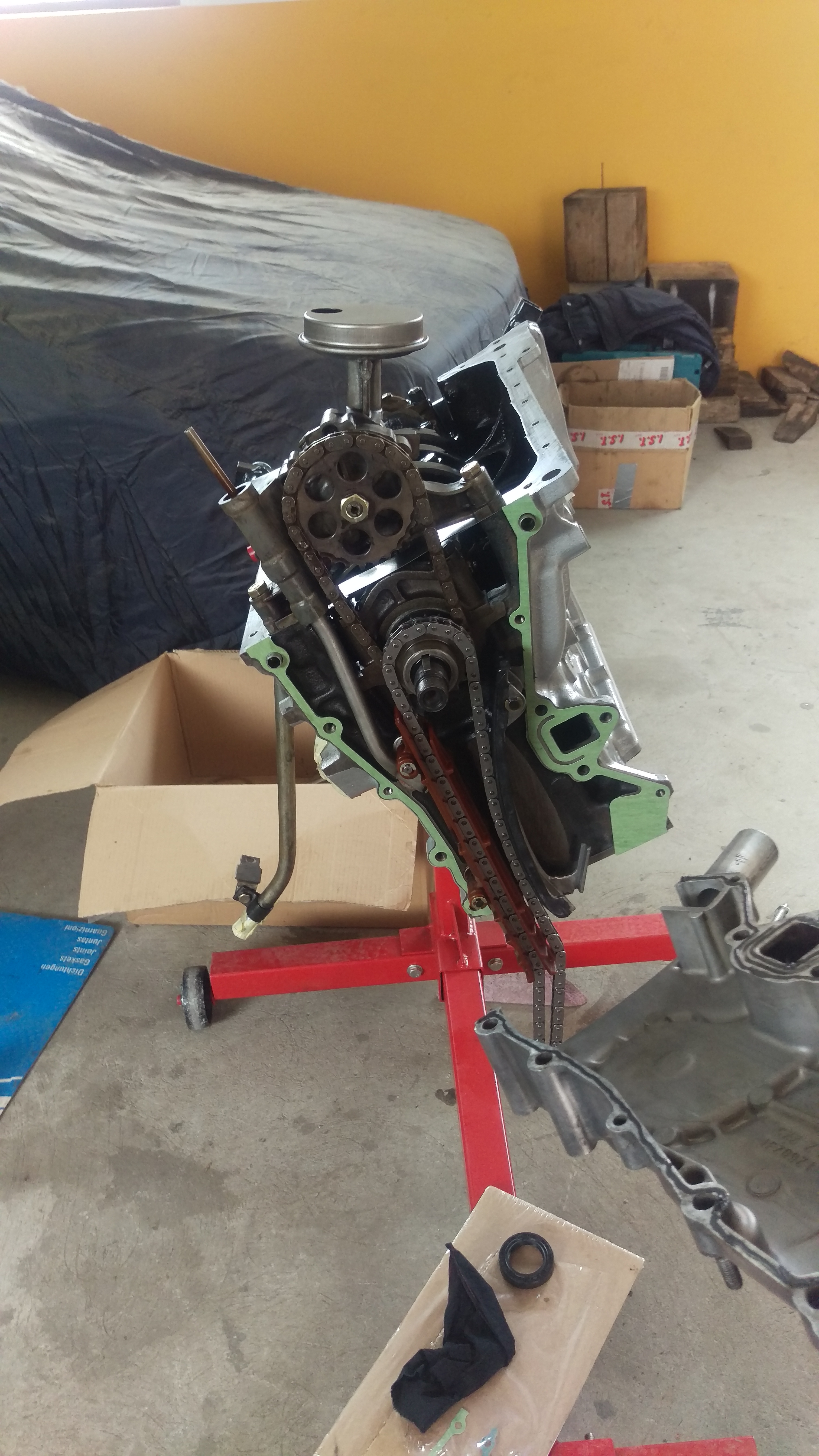 Motor je sestavljen, potrebno je bilo znižati še zgornji pokrov kjer teče veriga, da se je pokrov ventilov lepo usedel...(v ozadju pa že nov projekt v delavnici B-) )