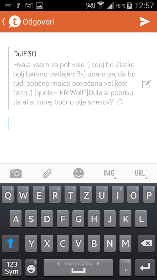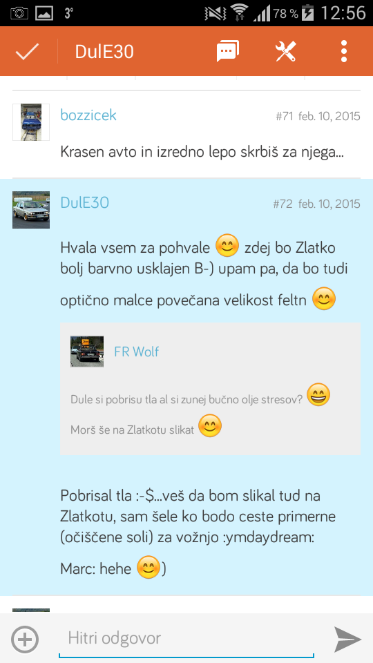 Vidimo, da je tudi tukaj možen hitri odgovor na temo, v primeru podrobnejšega urejanja, dodajanja smejkotov itd., pa kliknemo na plus spodaj levo:Če želimo določeno objavo citirat, preprosto kliknemo na njo in zgoraj se nam prikaže dvojni oblaček za citiranje: