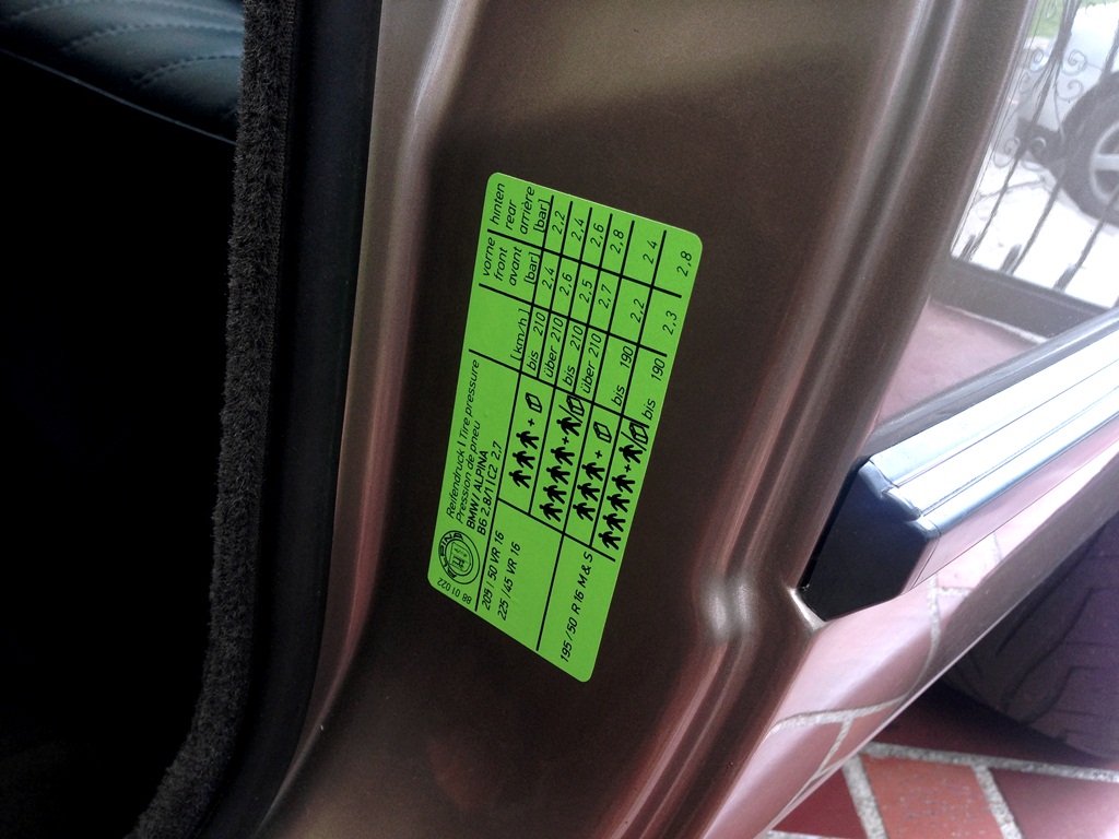-nalepka za tlake pnevmatik se nahaja na B stebričku vrat na voznikovi strani, velja za 2v (na sliki alpina nalepka, za bmw je pozicija ista samo srebrne barve):