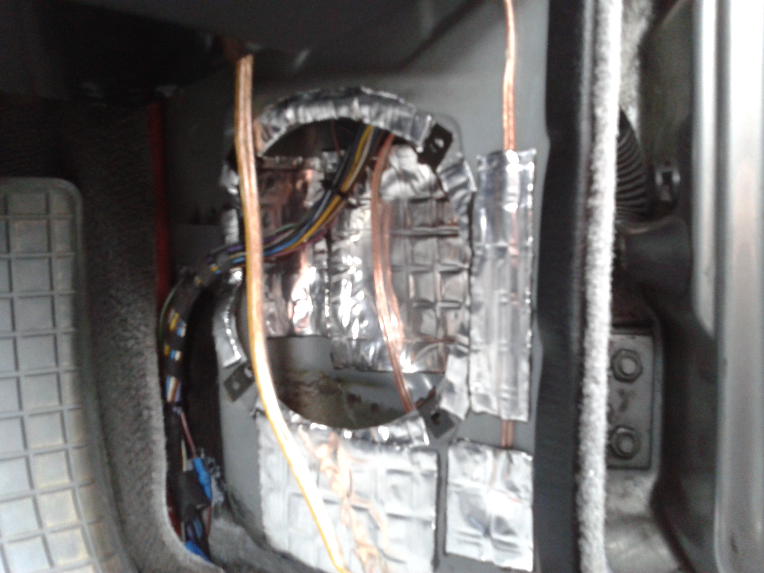 Priporočam predhodno podampiranje lokacije zvočnika z ustreznim stp materialom, in pa če se le da, vezavo na ojačevalec za pravi efekt. Nekega čudeža sicer ni za pričakovati od 13k, ki igrajo v noge, zato so pa visokotonci toliko bolj pomembni. Če niso neke vesoljske oblike se jih da v avto dokaj lepo vkomponirat. Ob uporabi močnejših zvočnikov z več hoda se pojavi še en problem in sicer premalo prostora pod originalno tapeto...to je v tem primeru potrebno nekoliko predelati kot spodaj na sliki.