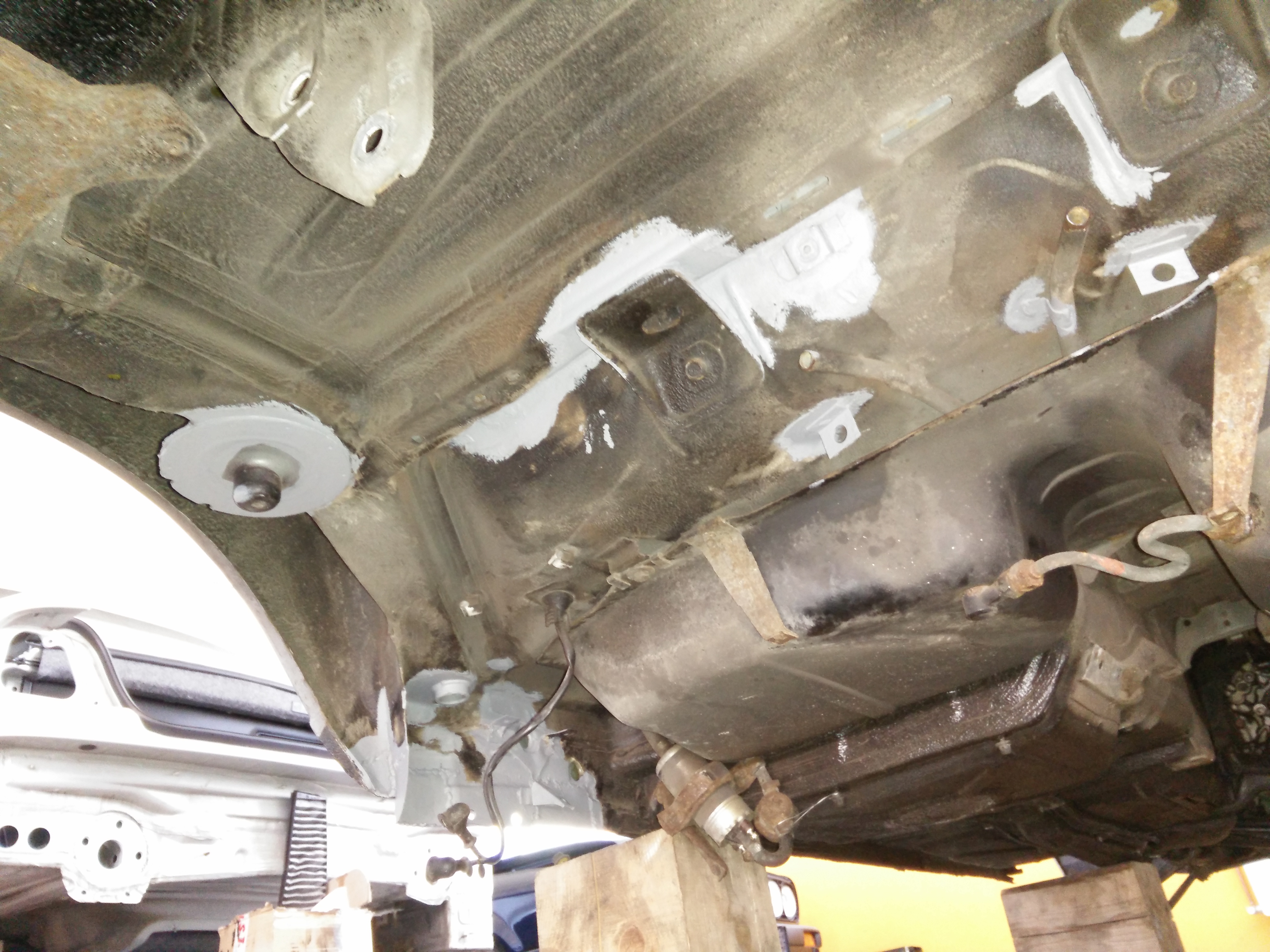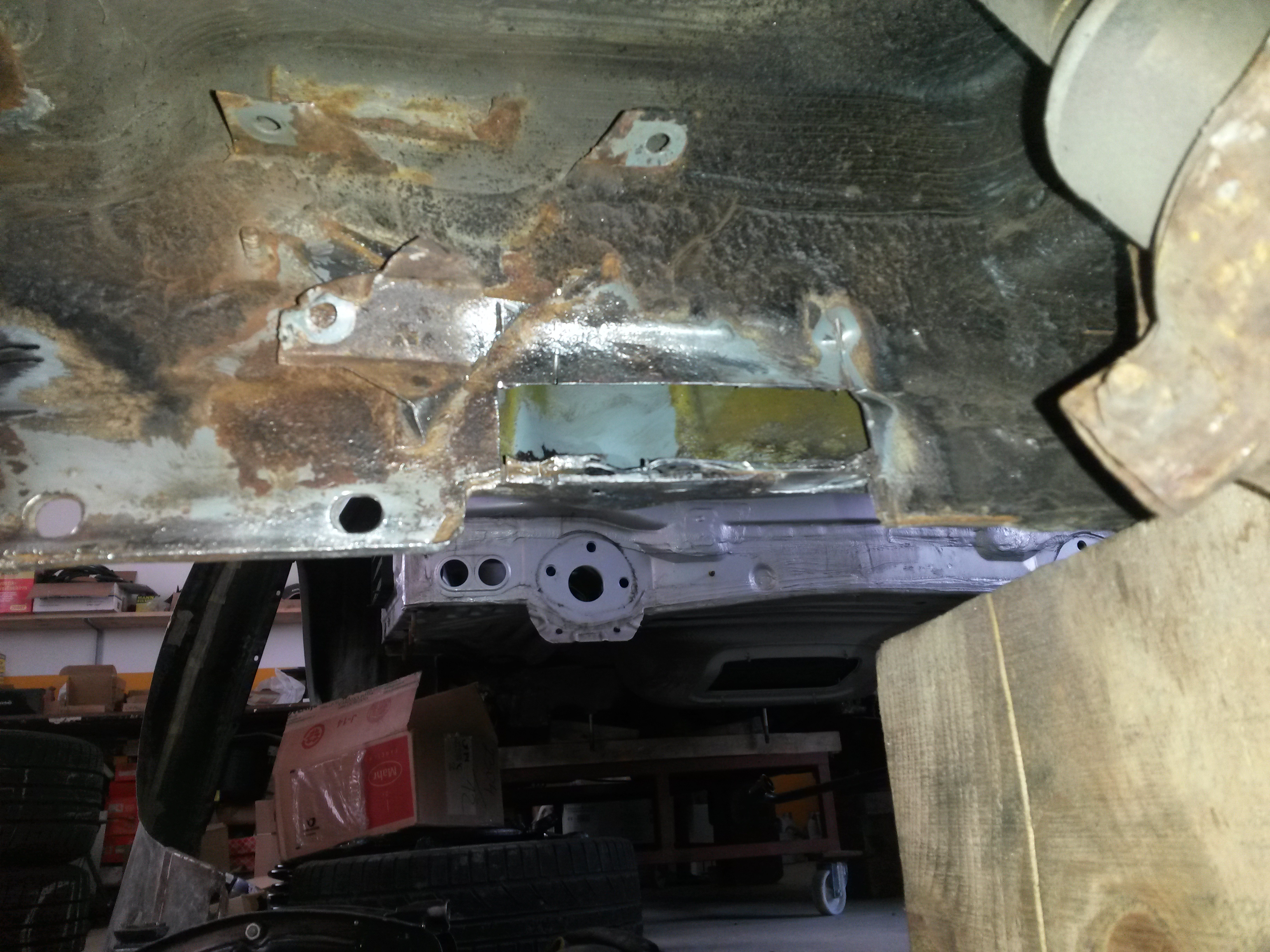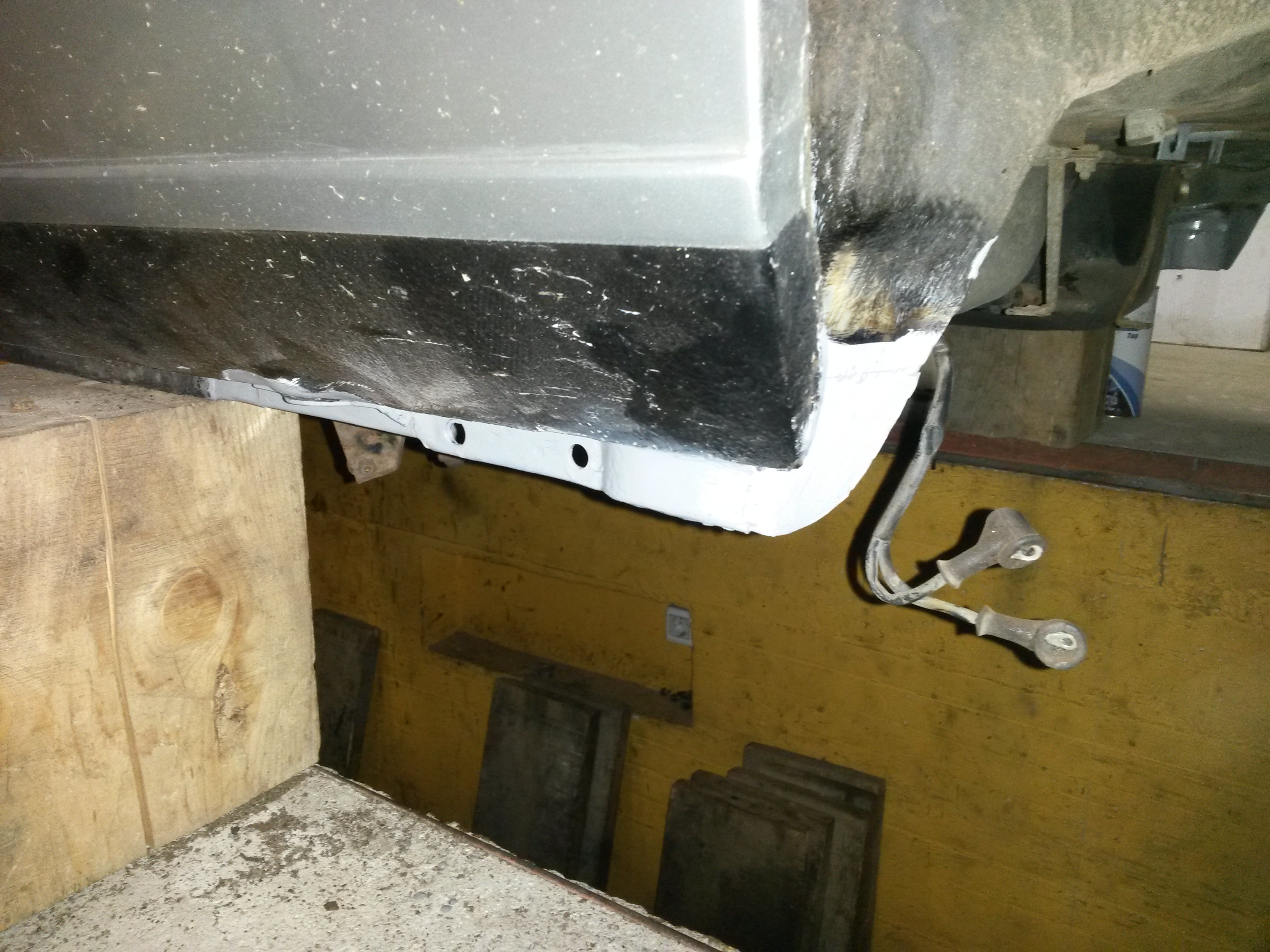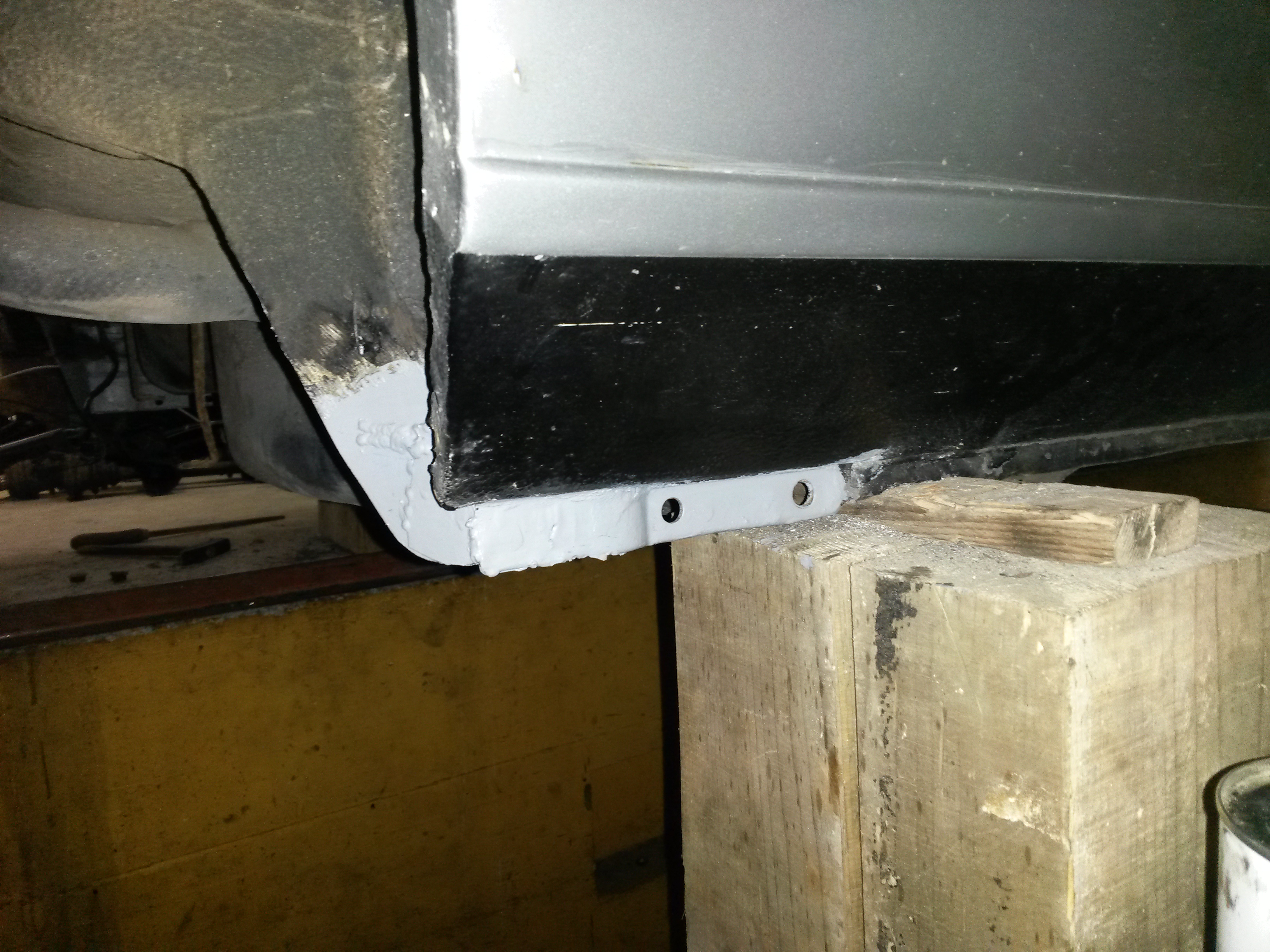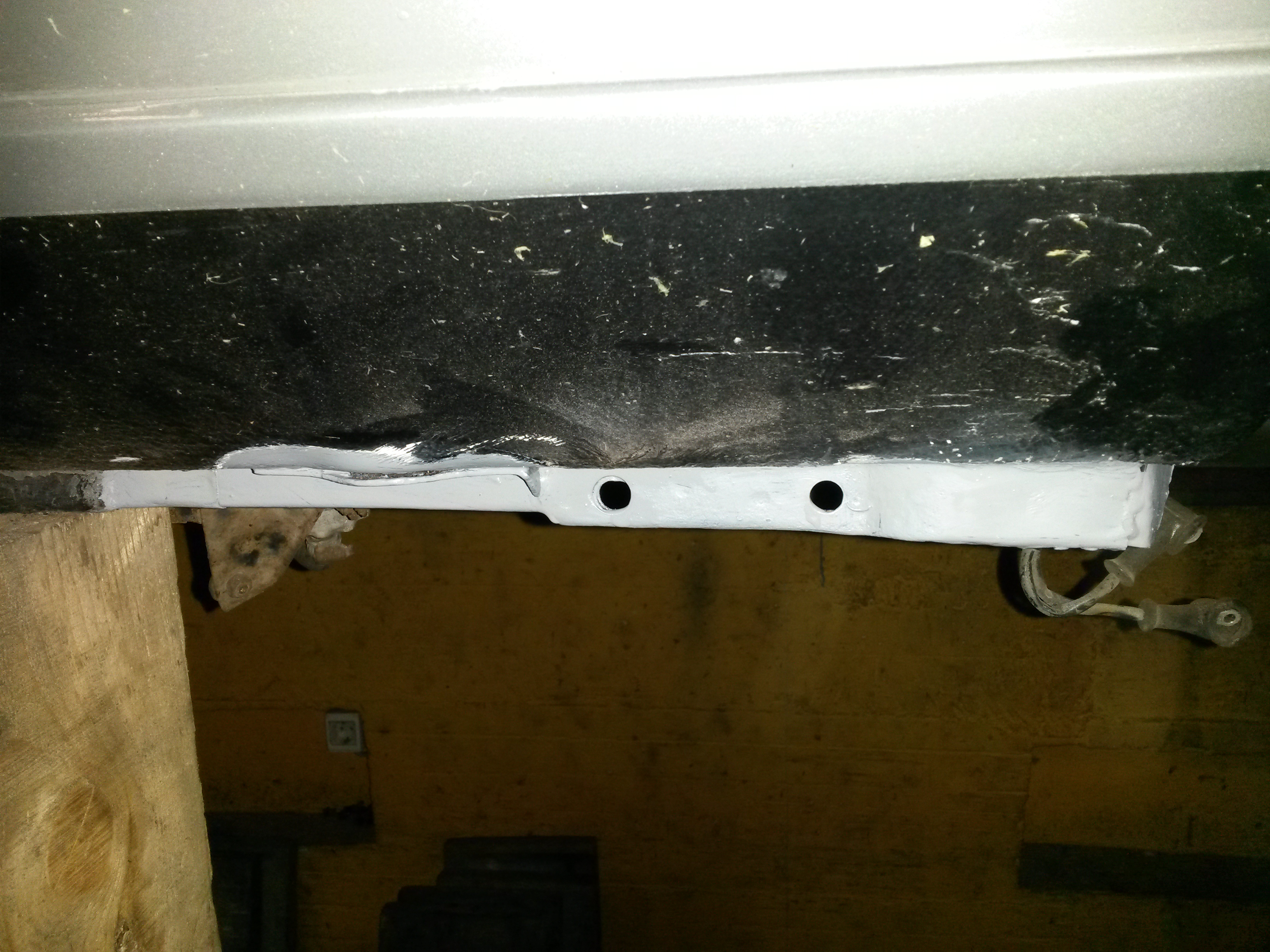 Ko sva z lancerjem spustila zadnji del avta na klocne, se je na levem zadnjem pragu pod mestom za dviganje sesedel rob (posledica preteklega slabega popravila oz. barvanje bitumna/silikona čez takrat verjetno še zanemarljivo načet rob). Z notranje strani je bilo treba zadevo odrezati, no pogled v prag je pokazal da je zdrav in je kritična točka res samo na tistem mestu. Vse skupaj na obeh pragih je bilo pri koncih za poflikat 3 luknje: