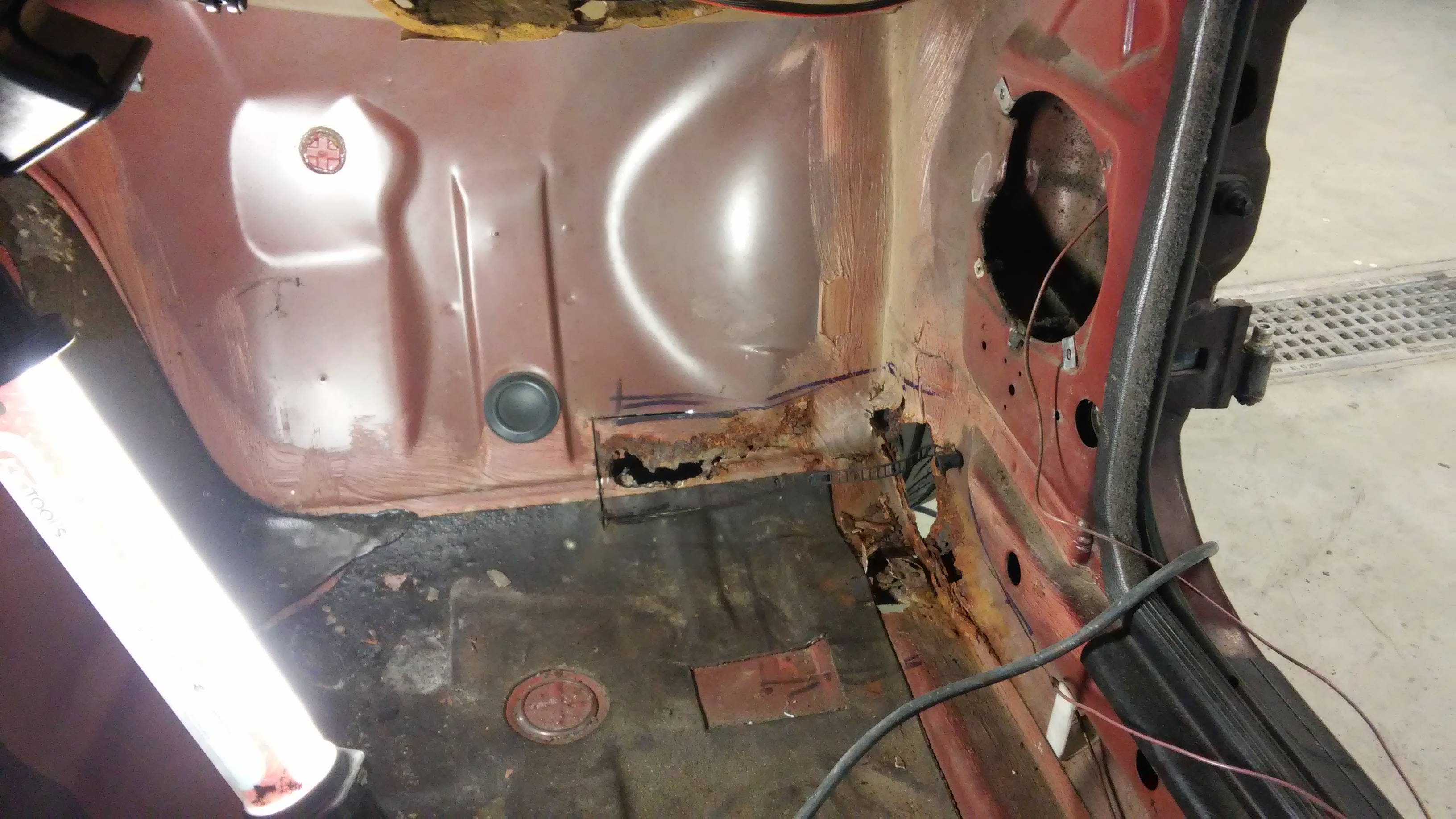 Obnova se je začela letos februara v šoli kot moj zaključni izpit. V šoli sem saniral komplet rjo na avtomobilu-novi pragovi, novi zadnji robovi, delna sanacija notranjih blatnikov, varjenje šasije ipd....Čez poletje sem doma končno postavil delavnico, nabavil opremo in nadaljeval z obnovo. Trenutno je avto le še nekaj brušenj stran od barvanja